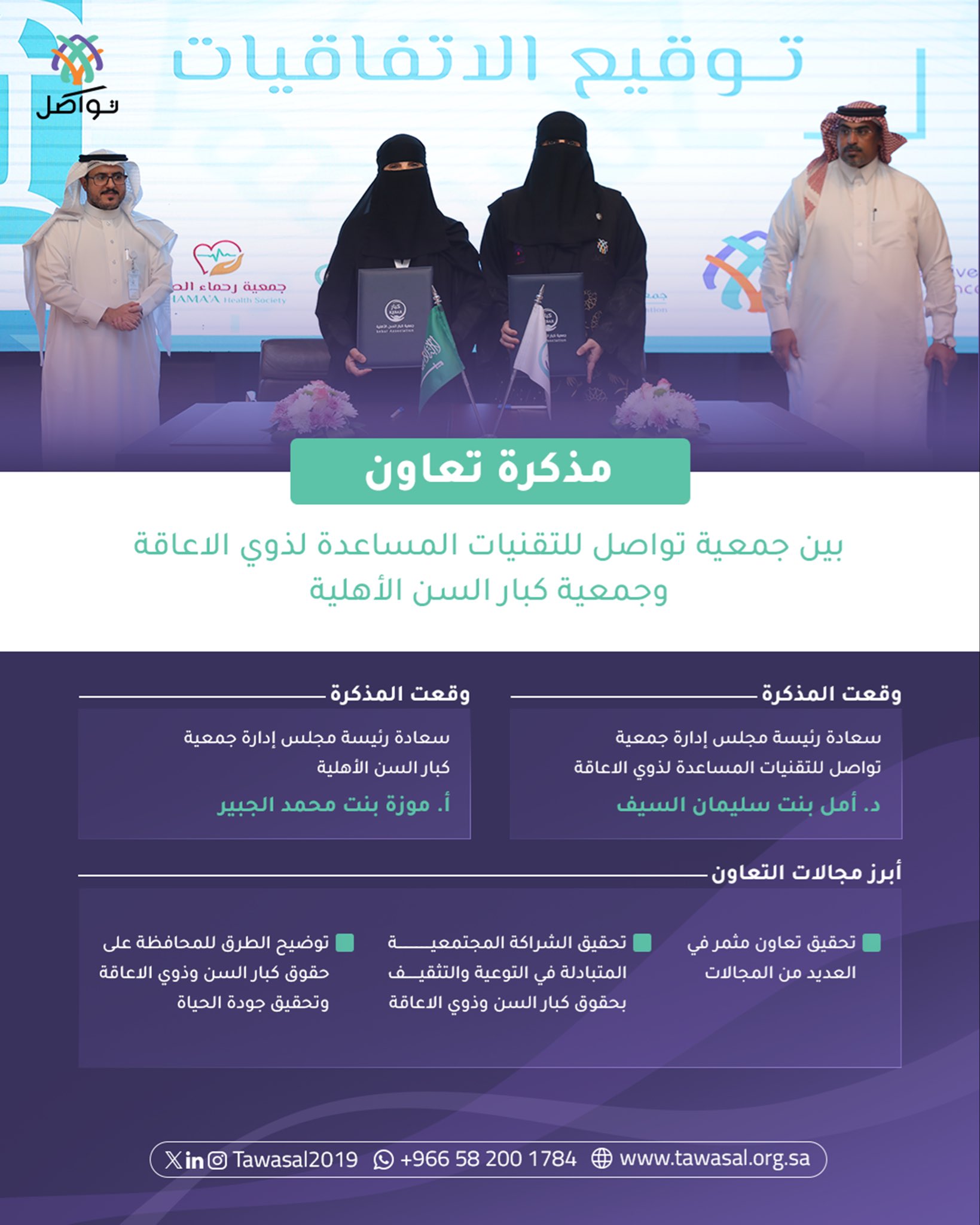 توقيع مذكرة تعاون بين جمعية تواصل لتقنيات المساعدة لذوي الإعاقة وجمعية كبار السن الأهلية